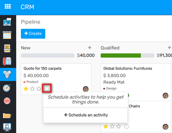 Aktivitäten können im Chat geplant und verwaltet werden, indem Sie au Aktivität planen klicken, oder über Kanban-Ansichten.